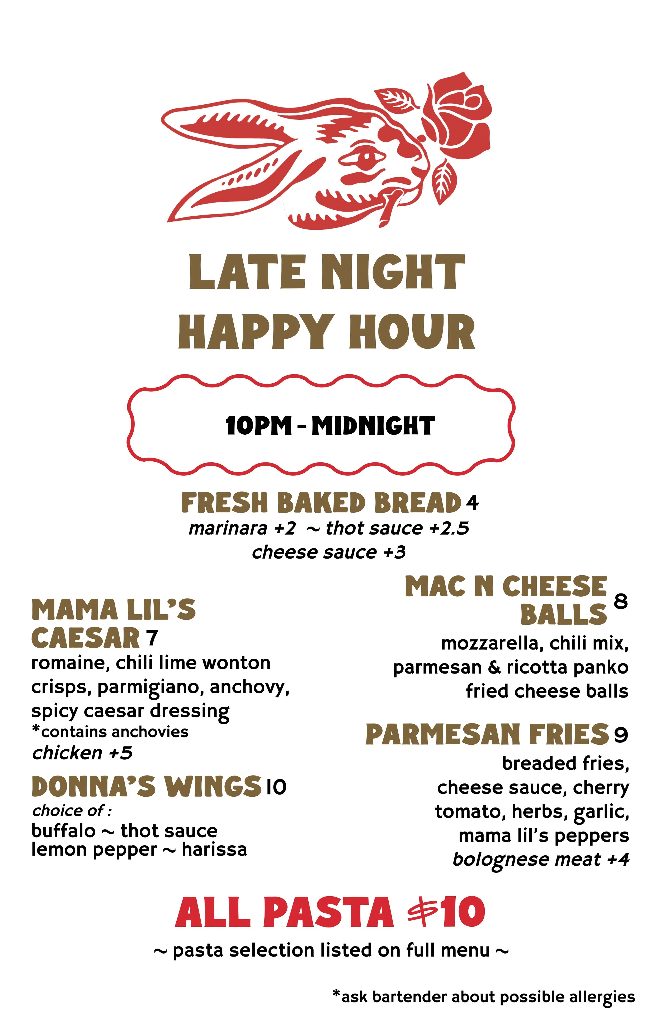 - late night happy hour - 10pm-midnight